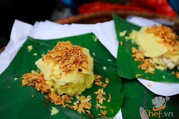 – Các thành phần món ăn đã chuẩn bị xong, bây giờ, bạn chỉ việc xới xôi ra đĩa, rưới mỡ gà vào, dùng dao cắt lát mỏng đậu xanh lên trên, cuối cùng là thêm hành phi, chà bông và thưởng thức ngay món ăn hấp dẫn này.