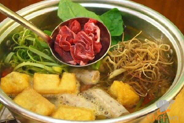 – Dọn kèm cùng với bún tươi, rau sống và thịt bò, thưởng thức đến đâu thì cho nguyên liệu vào đến đấy. Vậy là bạn hoàn tất món lẩu.
