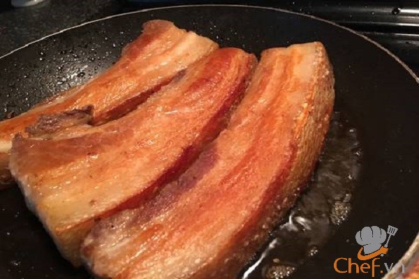 – Bắc chảo lên bếp đun nóng với chút dầu ăn, khi dầu già thì bỏ thịt vào chiên vàng đều các mặt. Lưu ý: mục đích chỉ chiên phần da nên bạn không cần cho nhiều dầu, khi cho thịt vào phải để phần da heo áp chảo. Sau khi da heo đã vàng, bạn vớt ra, cho vào thau nước lạnh ngâm khoảng 10 phút rồi để ráo.